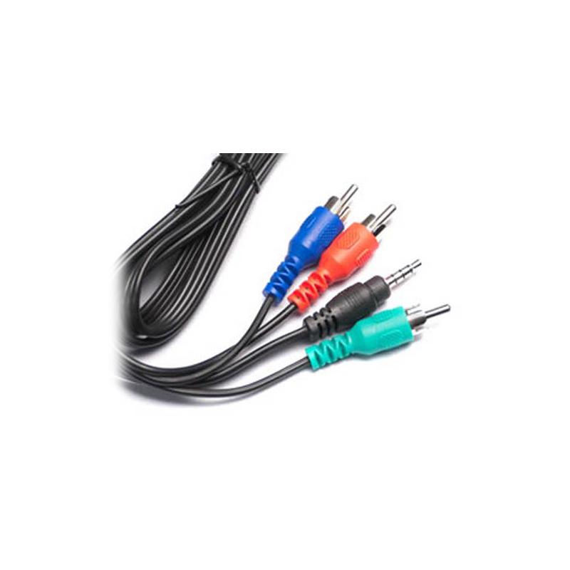 O cabo possui um conector Mini de 4 pinos em uma extremidade e três conectores RCA (vermelho, verde e azul) na outra extremidade.