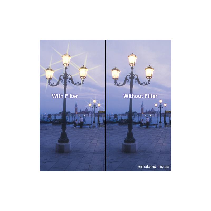 A intensidade e o brilho das linhas estelares dependem do tamanho, forma e luminosidade da fonte de luz. O espaçamento de 2 mm entre as linhas oferece um equilíbrio entre brilho e sutileza no efeito estelar. Além disso, a Tiffen disponibiliza filtros com espaçamentos de 1 mm a 4 mm, permitindo maior controle sobre o efeito desejado.