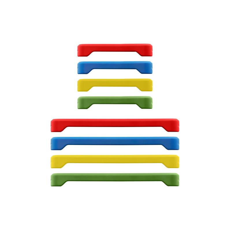 Cada faixa de silicone flexível envolve o corpo do transmissor ou receptor, permitindo que a cor identificável fique visível, mesmo à distância. O conjunto inclui faixas nas cores vermelho, amarelo, verde e azul, permitindo emparelhar até quatro sistemas distintos de forma prática.