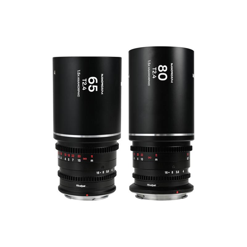 Este kit inclui duas lentes anamórficas Laowa Nanomorph de 65 mm e 80 mm T2.4 com squeeze constante de 1.5×, montadas em Sony E e com flare prata. São indicadas para sensores Super 35, oferecendo reflexos neutros e elegantes, exibição de bokeh oval clássico e estética cinematográfica clean.