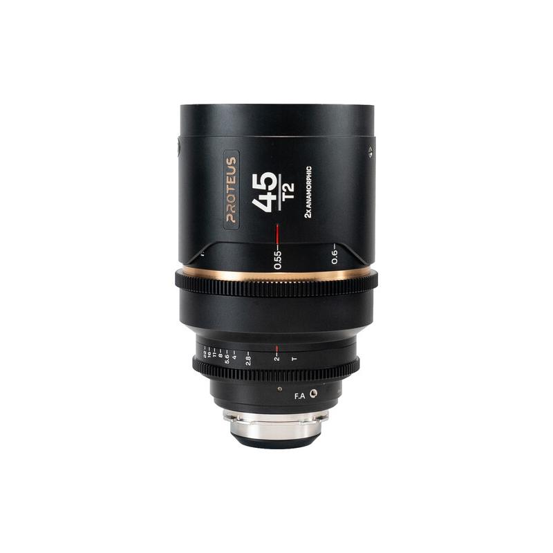 A Laowa Proteus 2× 45 mm T2 oferece visual anamórfico real com compressão fixa de 2×, resultando em formato widescreen 2,39:1, bokeh elíptico e flares âmbar quentes. Desenvolvida para sensores Super 35, cobre esse formato de forma nativa e permite uso em full-frame com expansor 1,4×. Com abertura constante de T2 a T22, diafragma de 10 lâminas, foco manual com rotação de 300°, engrenagens padrão 0.8 MOD, rosca de filtro de 105 mm, diâmetro frontal de 114 mm e peso de cerca de 2,4 kg, ela entrega performance técnica de alto nível e ergonomia profissional. A distância mínima de foco de 55 cm favorece closes expressivos