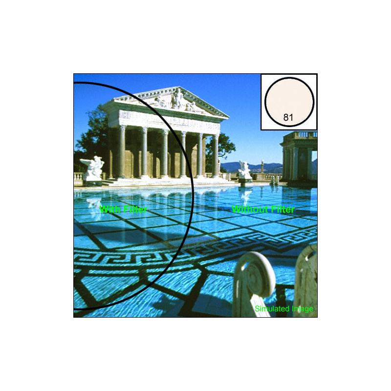 O Tiffen Filtro 4x4 81 Conversão de Cor é um filtro de balanceamento de luz que reduz a temperatura de cor em 100K, proporcionando um leve aquecimento na imagem para corresponder à qualidade de iluminação desejada. Ao utilizar este filtro, é possível atingir um equilíbrio de 3200K quando a fonte de luz predominante é de 3300K. O efeito de aquecimento deste filtro requer um aumento de 0,3 ponto na exposição para resultados normais.