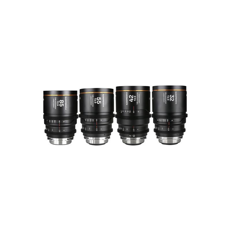 O Venus Optics Laowa Kit Nanomorph LF 1.5× T2.9 Âmbar é um conjunto cinematográfico de quatro lentes anamórficas de foco manual com squeeze horizontal de 1.5× (proporção final de 2.66:1 em sensor 16:9 após de‑squeeze). Inclui as distâncias focais 32 mm, 42 mm, 55 mm e 85 mm, todas com abertura constante T2.9, cobrindo sensores full-frame e formatos Large Format com círculo óptico de cerca de 44,7 mm.