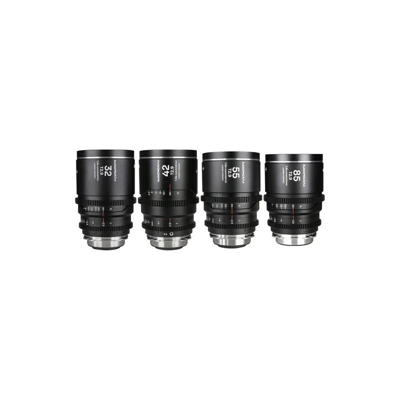 O Venus Optics Laowa Kit Nanomorph LF 1.5× T2.9 Prateado é um conjunto profissional de quatro lentes anamórficas de foco manual com compressão horizontal de 1.5× (visual cinematográfico ~2.66:1 em sensor 16:9 após de‑squeeze). Inclui distâncias focais de 32 mm, 42 mm, 55 mm e 85 mm, todas com abertura constante T2.9, projetadas para cobertura total em full-frame e formatos large-format, com círculo de imagem de aproximadamente 44,7 mm.